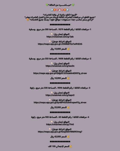 ابدأ خطواتك نحو مشروعك المثالي أو منزل التقاعد من خلال شراء هذه الأرض السكنية اليوم. بسعر منافس يبلغ 8000 ريال عماني، هذه الممتلكات معروضة للبيع. لا تفوت هذه الفرصة الفريدة لتأمين مستقبلك في بركاء، الباطنة. اتصل بنا الآن للحصول على المزيد من التفاصيل ولجدولة زيارة. اغتنم الفرصة لتحويل هذه الأرض إلى منزل أحلامك! فكل لحظة مهمة في العقارات؛ تصرف بسرعة واتصل اليوم.