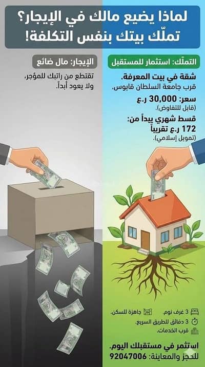 هذه الشقة ليست مجرد مكان للعيش؛ إنها مجتمع يمكنك الازدهار فيه. تقع في منطقة الخوض المرغوبة، ستتمكن من الوصول بسهولة إلى المدارس ومراكز التسوق وغيرها من المرافق الأساسية. مع تردد الإيجار الشهري، تعتبر هذه العقار فرصة استثمارية ممتازة لأولئك الذين يبحثون عن شراء منزل في واحدة من أكثر الأحياء حيوية في مسقط.