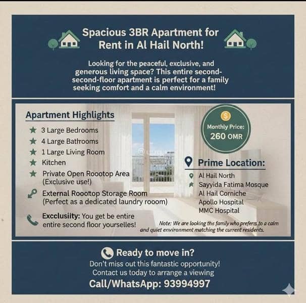 في الختام، تقدم هذه الشقة في الهيل فرصة رائعة لأي شخص يتطلع لاستئجار منزل واسع ومجهز جيدًا في مسقط. لا تفوت هذه الفرصة—اتصل بنا اليوم لتحديد موعد لزيارة الملكية واجعل هذه الشقة منزلك القادم.