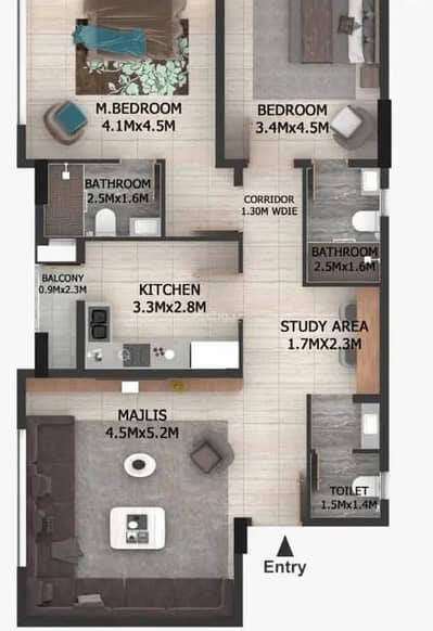 - أرضيات تغطي الشقة بالكامل، مما يوفر المتانة وسهولة الصيانة.