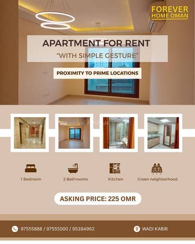 ريال225شهرياًشقة12المساحة:64 متر مربعشقة غرفة نوم واحدة للإيجار في الوادي الكبير، مسقطوادي الكبير، مسقط الإيميل اتصل
